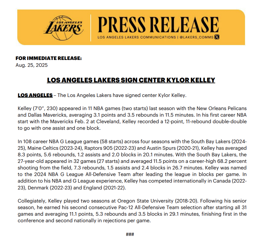 北京时间8月26日,洛杉矶湖人队官方宣布签下中锋凯洛尔-凯利。据悉,这是一份训练营合同。